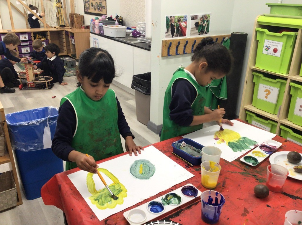 This week, the Penguins and Turtles have enjoyed exploring the story Handa’s Surprise. Many of our activities were based on the book, including colour-mixing at the painting table to create the fruits from the story. Can you spot the green crown of the pineapple and the purple passionfruit?