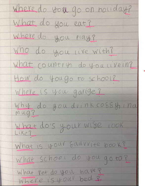 The Koalas have been writing questions about a character in our new book.  We used question words such as 'how' and 'what' and finished our sentences with question marks.