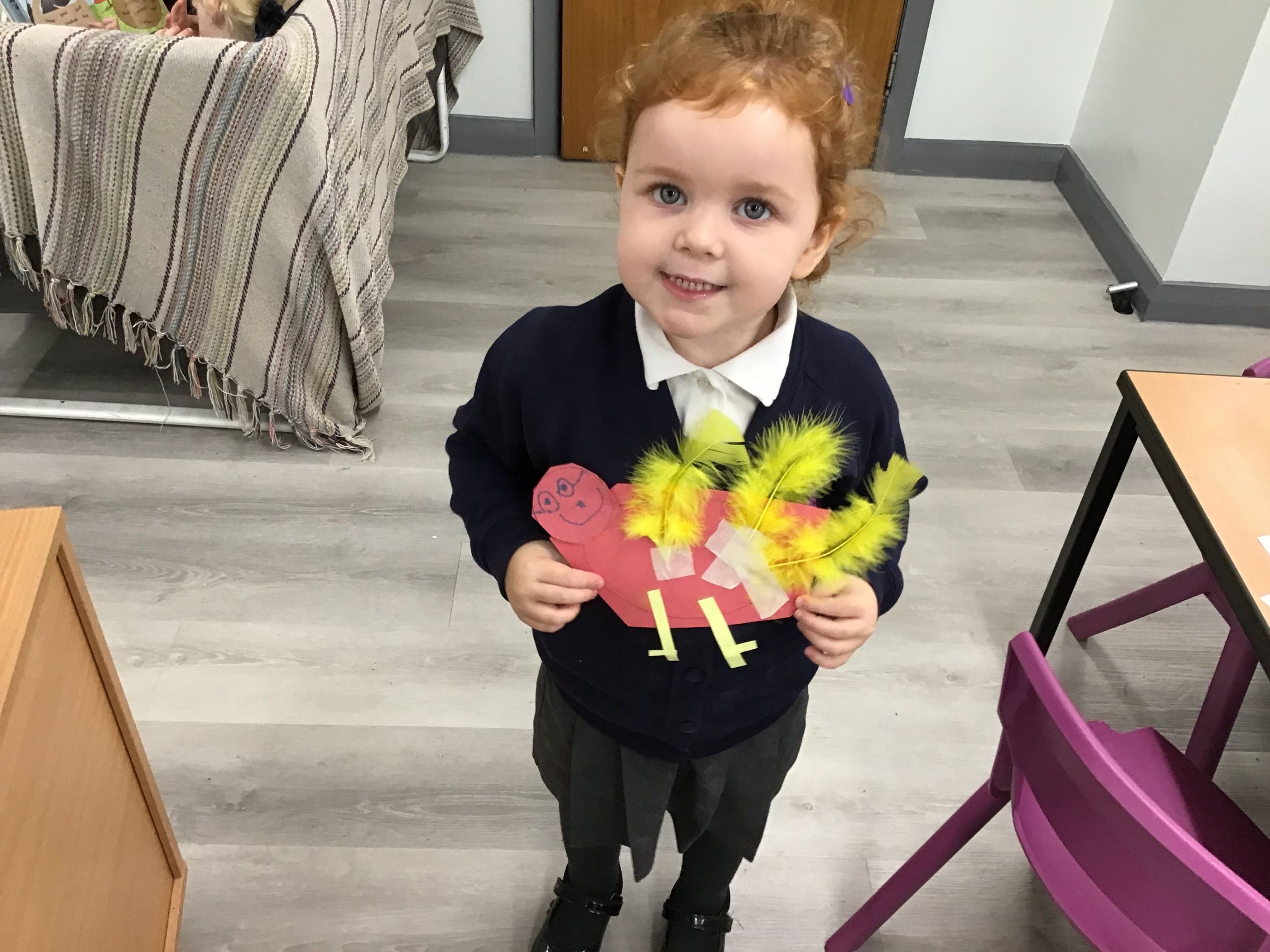 In the FS the children have been learning about Harvest and enjoyed the story of the Little Red Hen. They have made bread as part of our activities this week and have also made their own pictures at the creation station. Darla used scissors and glue to make her little red hen.