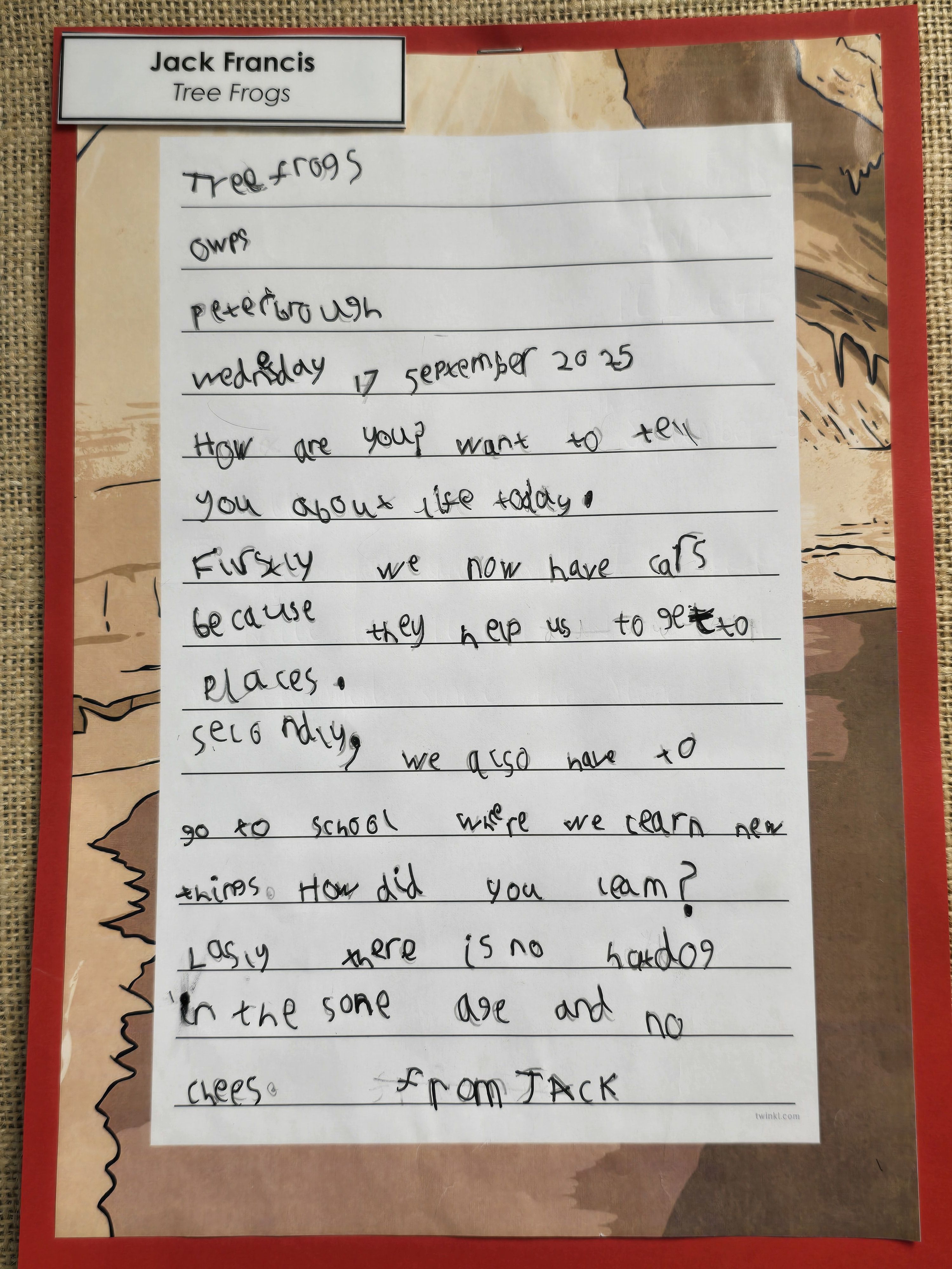 In Year 3, the Tree Frogs have been comparing life in the Stone Age, with things from the modern day. Jack wrote a letter to UG, the main character from our Stone Age text, to explain the differences. Great job, Jack!