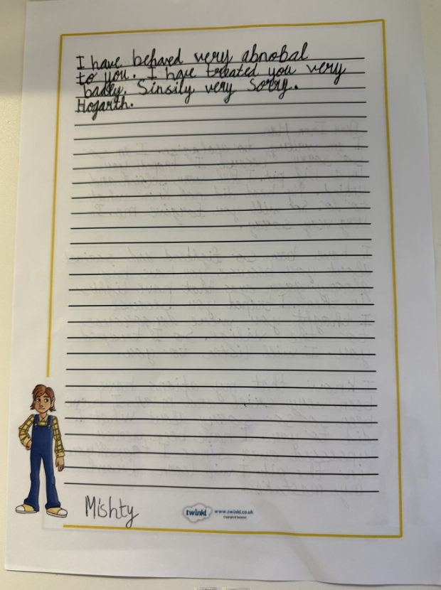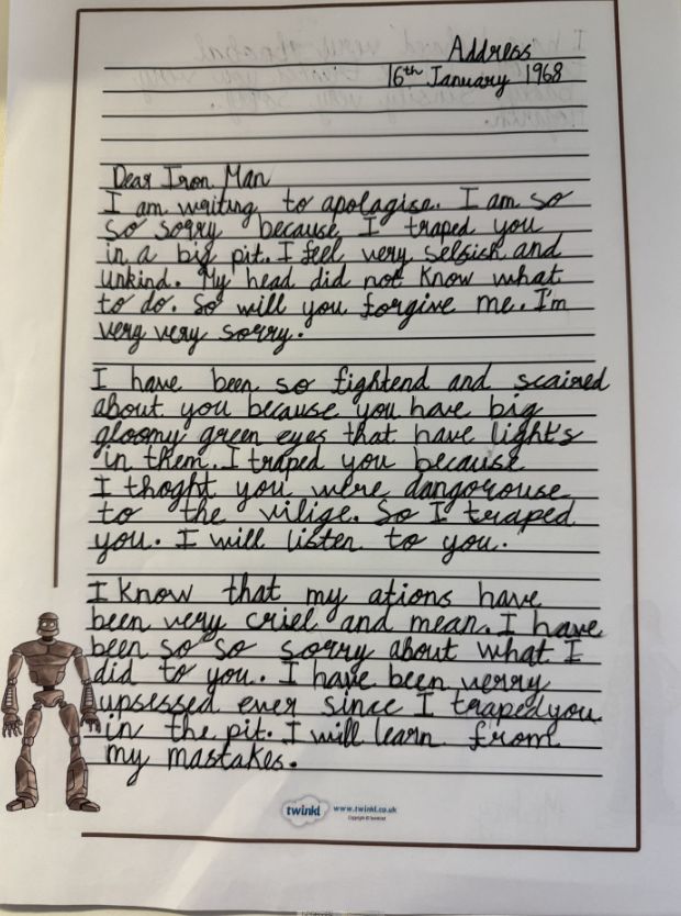 The class have been writing letters as part of their English work based on the IronMan. Mishty wrote a wonderful letter to the Iron Man apologising for trapping him in a big pit.