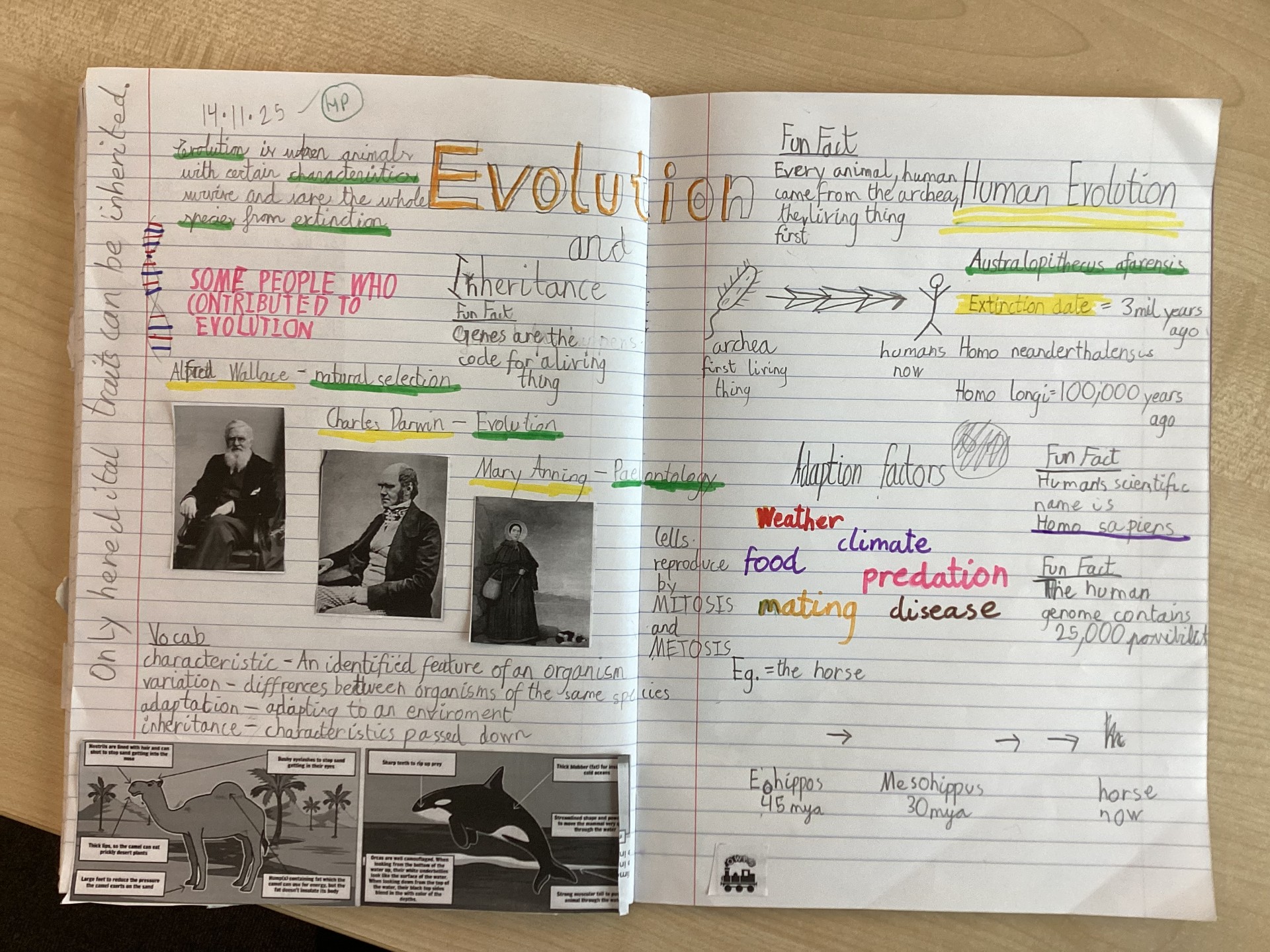 Here is a double page spread by Eshan, showing his knowledge of our Science topic on evolution and inheritance.