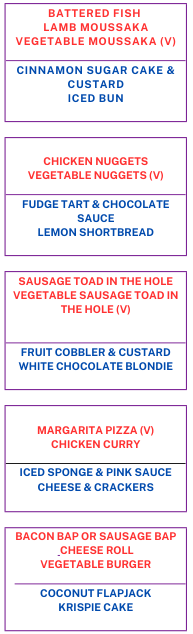This week the delicious menu includes Battered Fish or Vegetable Moussaka, Chicken Nuggets or Vegetable Nuggets, Pizza or Chicken Curry, Pastry, Iced Bun, Coconut Flapjack, Cheese and Crackers and much, much more!