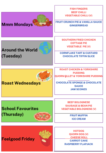 The menu for the week beginning after half-term includes Fish Fingers or Vegetable Chilli, Cottage Pie or Vegetable Pie, Hotdog or Quorn Dog, Cornflake Tart, Fruit Muffin, Carrot Cake and much, much more!