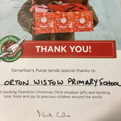 On 16th December 2021, Mrs Hales, who coordinated the collection of shoeboxes from Orton Wistow Primary School, came in with a special certificate to say a big THANK YOU to everyone who gave donations to Operation Christmas Child. There were a total of 136 boxes collected in the Orton Wistow Community. Thank you to everyone who gave their support!
